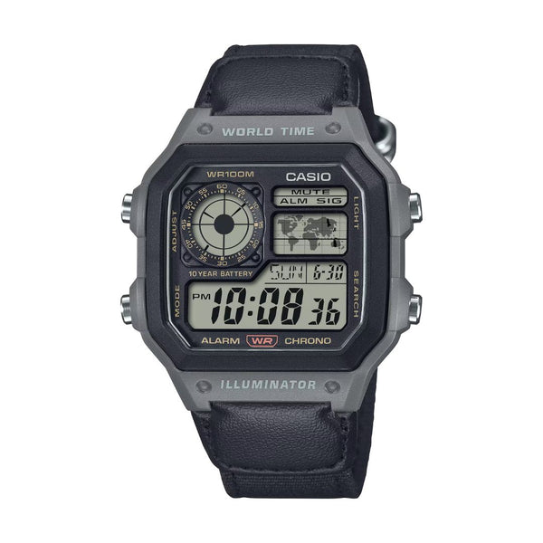 Harmaa-musta Casio AE-1200WHUB-8AV digitaalinen rannekello maailmankarttanäytöllä Casio AE-1200WHUB-8AV on digitaalinen rannekello, jossa maailmankarttanäyttö sekä useat kellonajat helpottavat ajan seuraamista eri aikavyöhykkeillä. Näytön eri osiot pitävät koti- ja paikallisajan jatkuvasti näkyvissä ilman säätöä. Kevyt rakenne, kangasranneke sekä 100 metrin vesitiiviys tekevät mallista toimivan arkeen ja matkustamiseen. Jopa 10 vuoden paristonkesto ja LED-taustavalo viimeistelevät huolettoman käytön. Mallin tärkeimmät ominaisuudet: Digitaalinen näyttö Maailmanaika (31 aikavyöhykettä, 48 kaupunkia, 4 eri aikaa) Kaksoisaika (kotiaika + yksi toinen aikavyöhyke) Ajanotto (1/100 s) Ajastin (lähtölaskenta) 5 hälytystä Automaattinen kalenteri (vuoteen 2099) LED-taustavalo 12/24 h näyttö Koneisto: kvartsi (paristo) Pariston kesto noin 10 vuotta Uintitiivis (100 m / 10 bar) Lasi: hartsilasi Rannekkeen pituus: 145-215 mm Rannekkeen materiaali: kangas Kuoren koko: 45 x 42,1 x 12,5 mm Kuoren materiaali: hartsi Väri: harmaa / musta Paino: 42 g Casio on japanilainen elektroniikkalaitteiden valmistaja, joka on tunnettu erityisesti laadukkaista ja kestävistä urheilukelloistaan. Casio-kellot ovat ominaisuuksiltaan monipuolisia ja ne sopivat niin extremelajeihin kuin aktiiviseen arkeenkin. Casio-kellot ovat suosittuja myös varusmiesten keskuudessa niiden kestävyyden ja erinomaisen hinta-laatusuhteen ansiosta. Katso kaikki Casio-tuotteet täältä