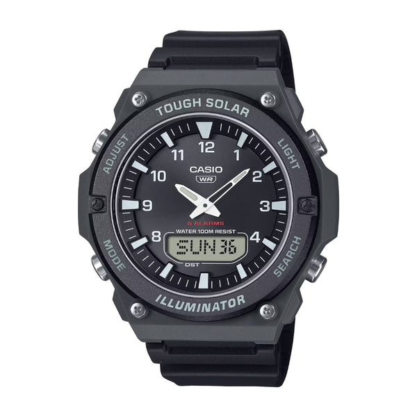 Casio AQ-S820W-1AVEF miesten rannekello mustalla rannekkeella ja kellotaululla Casio AQ-S820W-1AVEF on tyylikäs anadigi-rannekello, jonka musta ranneke ja kellotaulu luovat yhtenäisen, ajattoman ilmeen. Vaaleat indeksit sekä viisarit parantavat luettavuutta, ja solar-koneisto tekee kellosta vaivattoman käyttää ilman jatkuvaa paristonvaihtoa. Digitaalinen näyttö täydentää kokonaisuutta tuomalla mukaan käytännölliset lisätoiminnot. Malli sisältää monipuolisesti ominaisuuksia: Analoginen ja digitaalinen näyttö Vesitiivis 100 m asti Maailmanaika (31 aikavyöhykettä) Sekuntikello Kaksi ajastinta Hälytykset LED-taustavalo Automaattinen kalenteri Hartsilasi Koneisto: solar (aurinkokäyttöinen) Käyttöaika noin 10 kk (jopa 23 kk virransäästöllä) Kuoren koko: 52,5 x 50,1 x 12,7 mm Paino: 46 g Rannekkeen pituus: 145-215 mm Rannekkeen materiaali: hartsi Kuoren materiaali: hartsi Väri: tumma / musta Casio on japanilainen elektroniikkalaitteiden valmistaja, joka on tunnettu erityisesti laadukkaista ja kestävistä urheilukelloistaan. Casio-kellot ovat ominaisuuksiltaan monipuolisia ja ne sopivat niin extremelajeihin kuin aktiiviseen arkeenkin. Casio-kellot ovat suosittuja myös varusmiesten keskuudessa niiden kestävyyden ja erinomaisen hinta-laatusuhteen ansiosta. Katso kaikki Casio-tuotteet täältä
