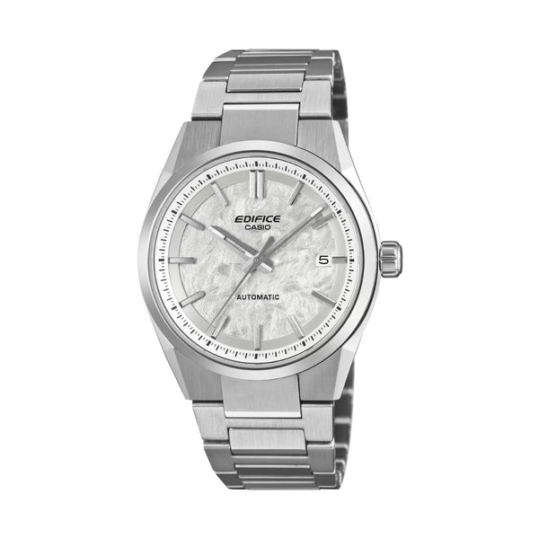 Casio Edifice Automatic EFK-110D-7AER miesten rannekello hopeanvärisellä kellotaululla Casio EFK-110D-7AER on upeasti viimeistelty automaattikello, jossa hopeansävyinen, hienovaraisesti teksturoitu kellotaulu muistuttaa kevyesti helmiäistä. Kompakti kuori sekä teräsranneke tekevät mallista kevyen ja miellyttävän käyttää päivittäin. Safiirilasi parantaa myös kestävyyttä ja helpottaa luettavuutta kirkkaassa valossa, ja läpinäkyvä takakansi tuo mekaanisen koneiston liikkeen tyylikkäästi esiin. Mallissa onkin muun muassa seuraavat toiminnot: Analoginen kellotaulu Automaattikoneisto manuaalivedolla Käyntivara noin 42 tuntia Päivämääränäyttö Sekuntiviisarin pysäytys 21 kivilaakeria Naarmunkestävä safiirilasi Luminoidut viisarit Uintitiivis 100 m Koneisto: automaattikoneisto Kuoren koko: 43 x 38 x 11,8 mm Rannekkeen pituus: 150-205 mm Paino: 143 g Rannekkeen materiaali: ruostumaton teräs Kuoren materiaali: ruostumaton teräs Väri: hopea / valkoinen Casio on japanilainen elektroniikkalaitteiden valmistaja, joka on tunnettu erityisesti laadukkaista ja kestävistä urheilukelloistaan. Casio-kellot ovat ominaisuuksiltaan monipuolisia ja ne sopivat niin extremelajeihin kuin aktiiviseen arkeenkin. Casio-kellot ovat suosittuja myös varusmiesten keskuudessa niiden kestävyyden ja erinomaisen hinta-laatusuhteen ansiosta. Katso kaikki Casio-tuotteet täältä