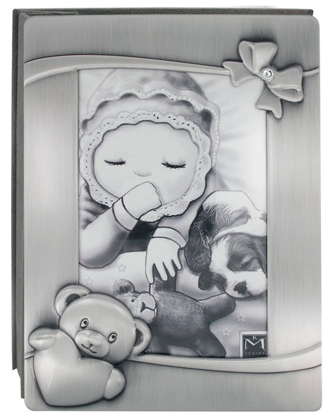 Valokuva-albumi nalle ja rusetti Materiaali: tinaKorkeus: 19 cmLeveys: 14 cmPaksuus: 4 cmKuvakoko: 10×15 cm Kaunis lahjaidea kaste- tai syntymäpäivälahjaksi.