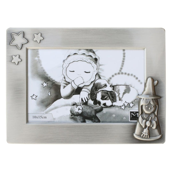 Kastekehys, jonka koristeena on haltijakummi Hopeanvärisessä valokuvakehyksessä on koristeena haltijakummi sekä tähtiä. Kehyksen kuvakoko on vaaka 15×10 cm. Sopii erinomaisesti kaste- tai nimiäislahjaksi. Kuvakoko: 10×15 cmKorkeus: 14 cmLeveys: 18 cmKehyksen materiaali: metalliTuotenumero: 078574 Katso kaikki kastekehykset täältä