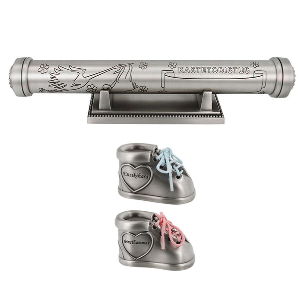 Kastetodistusputkilo sekä tossut ensihampaalle ja ensikiharalle Putkilon pituus: 24 cmTossut: 3,5×6 cm Kengän muotoiset rasiat, joihin mahtuu ensikihara ja ensihammas. Vaaleanpunaiset ja vaaleansiniset nauhat. Putken sisällä syntymätietotodistus. Tuotteeseen voidaan kaivertaa nimi ja muut tiedot (mikäli halutaan), kuten syntymäpäivä, paino ja pituus.
