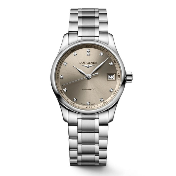 Teräksenharmaa Longines Master Collection L23574076 naisten rannekello, jossa on beige kellotaulu ja timantit indekseinä. Longines Master Collection on yhdistelmä klassista eleganssia ja erinomaista laatua niille, jotka arvostavat poikkeuksellisia kelloja. Tässä teräksenharmaassa naisten Longines-rannekellossa on aurinkoharjattu beigenvärinen kellotaulu ja 12 Top Wesselton VS-SI-timanttia indekseinä. Kellossa on päivyri kello kolmen kohdalla. Kokonaisuutta täydentää teräsranneke, jossa on sekä harjattua että kiiltävää pintaa. Rannekkeessa on kolmitaitelukko painikkeilla. Longines Masten Collection -kellossa on automaattikoneista 72 tunnin käyntivaralla ja kellotaulua suojaa naarmuuntumaton safiirilasi heijastuksenestopinnoitteella. Myös kellon tausta on läpinäkyvä ja suojattu safiirilasilla. Mallinumero: L23574076Kuoren materiaali: ruostumaton teräsKuoren väri: teräksenharmaaKuoren halkaisija: 34 mmKellon paksuus: 9,2 mmRannekkeen materiaali: ruostumaton teräsRannekkeen väri: teräksenharmaaRannekkeen leveys: 18 mmKellon paino: 92,9 gSafiirilasi, naarmuuntumatonKellotaulu: beigeTimantit: 12 Top Wesselton VS-SI-timanttia (0,055 ct)PäivämääränäyttöVesitiiviys: 30 metriä (3 bar)Koneisto: automaattiKäyntivara: 72 tuntia Katso kaikki Longines-kellot täältä