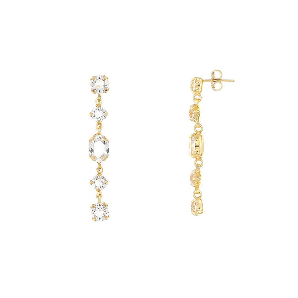 Keltakullatut Stelle-hopeakorvakorut zirkoneilla Riippuvissa Stelle-korvakoruissa on allekkain viisi eri kokoista zirkonia. Keltakullattu korvakoru on näyttävä ja tyylikäs asuste, jota voi käyttää arjessa ja juhlassa. Korvakorut on keltakullattua hopeaa. Materiaali: keltakullattu hopeaKivet: zirkonitPituus: 4,2 cm Katso kaikki Stelle-korut täältä