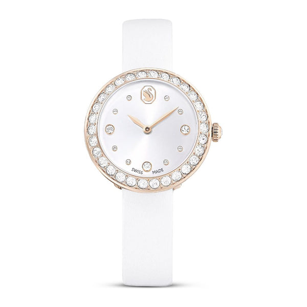 Samppanjakullanvärinen Matrix tennis -rannekello kirkkailla kristalleilla ja nahkarannekkeella Swarovski Matrix tennis -rannekellossa on tyylikäs samppanjakullanvärinen kellonkuori, jonka kehällä kiertää rivi säihkyviä kristalleja. Vaaleassa kellotaulussa on indekseinä kahden kokoisia kristalleja sekä samppanjakullanvärinen Swarovskin joutsenlogo. Osoittimet ovat samppanjakullanväriset ja kauniisti muotoillut. Rannekkeena on valkoinen nahkaranneke, jossa on satiiniviimeistely. Kellon vesitiiveysluokka on 50 m ja kellossa on kvartsikoneisto. Tyylikäs Swarovski Matrix -malliston kello sopii yhdistettäväksi muiden Swarovski-korujen kanssa. Materiaali: ruostumaton teräsVäri: samppanjakultaKivet: kirkkaat kristallitRanneke: valkoinen nahkarannekeKuoren koko: 30 x 30 mmKuoren paksuus: 8 mmRannekkeen pituus: 14.5 – 19 cmVesitiiviys: 50 mKoneisto: QuartzTuotenumero: 5710103 Katso kaikki Swarovski-korut täältä