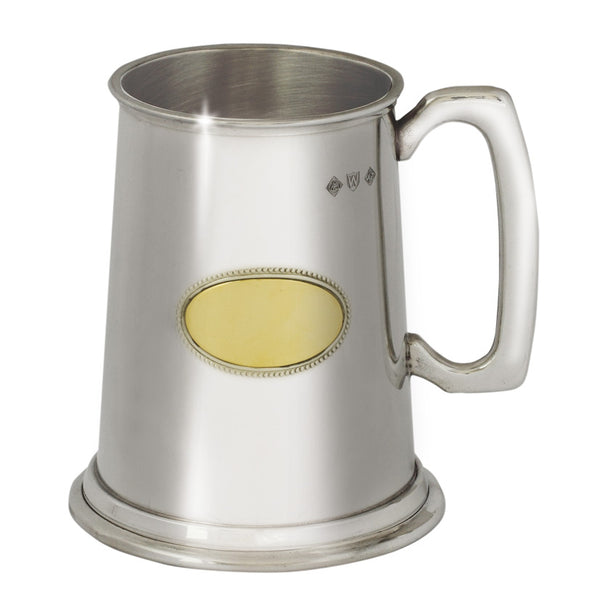 Tuoppi kaiverruslaatalla Materiaali: tinaKorkeus: 12 cm Kullanvärinen kaiverruslevy.