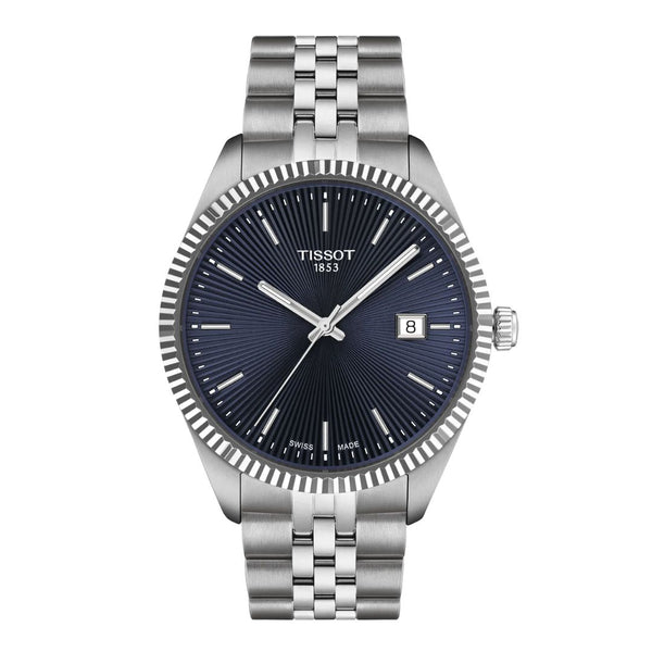 Teräksenharmaa Tissot Ballade T1564101104100 rannekello sinisellä Quilloche-kellotaululla Tyylikkäässä Tissot Ballade -rannekellossa on sininen Quilloche-kuvioitu kellotaulu. Kellotaulua kiertää uurrettu kellokehä, mikä edustaa perinteistä kellonvalmistustyyliä. Kellonkuori on 40 mm leveä. Sinisessä kellotaulussa on teräksenharmaan osoittimet ja indeksit sekä päivyri kello kolmen kohdalla. Kokonaisuutta täydentää viisirivinen teräsranneke, jossa on perhoslukko painikkeilla. Kellon vesitiiveysluokka on 100 metriä ja kellotaulua suojaa naarmuuntumaton safiirilasi.Tissot on perinteikäs sveitsiläinen kellovalmistaja, jonka mallistosta löytyy laadukkaita kelloja moneen makuun ja tyyliin. Tissot on vuodesta 1983 asti ollut osa Swatch Groupia, mutta sen juuret ulottuvat aina vuoteen 1853, jolloin kultaseppä Charles-Félicien Tissot perusti poikansa kanssa Sveitsin Le Locleen kelloverstaan. Tuotenumero: T156.410.11.041.00Kuoren materiaali: ruostumaton teräsKuoren väri: teräksenharmaaKellon halkaisija: 40 mmKellon paksuus: 8,25 mmRannekkeen materiaali: ruostumaton teräsRannekkeen väri: teräksenharmaaKellotaulun väri: sininenPaino: 120 gSafiirilasiPäivämääränäyttöVesitiiviys: 100 mKoneisto: Quartz EOL Katso kaikki Tissot-kellot täältä
