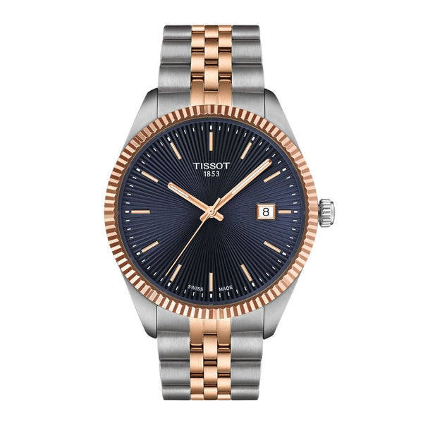 Kaksivärinen Tissot Ballade T1564102204100 miesten rannekello sinisellä Quilloche-kellotaululla Tyylikkäässä Tissot Ballade -rannekellossa on sininen Quilloche-kuvioitu kellotaulu. Kellotaulua kiertää ruusukullanvärinen uurrettu kellokehä, mikä edustaa perinteistä kellonvalmistustyyliä. Kellonkuori on 40 mm leveä. Sinisessä kellotaulussa on ruusukullanväriset osoittimet ja indeksit sekä päivyri kello kolmen kohdalla. Kokonaisuutta täydentää kaksivärinen ja viisirivinen teräsranneke, jossa on perhoslukko painikkeilla. Kellon vesitiiveysluokka on 100 metriä ja kellotaulua suojaa naarmuuntumaton safiirilasi.Tissot on perinteikäs sveitsiläinen kellovalmistaja, jonka mallistosta löytyy laadukkaita kelloja moneen makuun ja tyyliin. Tissot on vuodesta 1983 asti ollut osa Swatch Groupia, mutta sen juuret ulottuvat aina vuoteen 1853, jolloin kultaseppä Charles-Félicien Tissot perusti poikansa kanssa Sveitsin Le Locleen kelloverstaan. Tuotenumero: T156.410.22.041.00Kuoren materiaali: ruostumaton teräsKuoren väri: teräksenharmaa ja ruusukultaKellon halkaisija: 40 mmKellon paksuus: 8,25 mmRannekkeen materiaali: ruostumaton teräsRannekkeen väri: teräksenharmaa ja ruusukultaKellotaulun väri: sininenPaino: 120 gSafiirilasiPäivämääränäyttöVesitiiviys: 100 mKoneisto: Quartz EOL Katso kaikki Tissot-kellot täältä