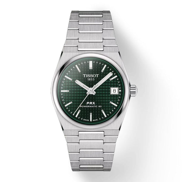 Teräksenharmaa Tissot PRX 35 mm T1372071109100 rannekello vihreällä vohvelikuvioidulla kellotaululla Autenttista vuoden 1978 muotoilua ja nykyaikaisia ominaisuuksia yhdistelevä Tissot PRX on tehty todellisille kellofaneille ja aidon designin ystäville. Tässä upeassa PRX-mallissa on harmaa teräskuori ja satiinipintainen teräsranneke sekä vihreä vohvelikuvioitu kellotaulu. Kello kolmen kohdalla on päivyri ja kellotaulua suojaa naarmuuntumaton safiirilasi. Powermatic 80 -automaattikoneisto 80 tunnin käyntivaralla ja antimagneettinen Nivachron-jousi päivittävät tämän ikonisen PRX-kellon ominaisuudet nykypäivään ja lisäävät sen luotettavuutta ja tarkkuutta. Kellon vesitiiveys on 100 metriä, jolloin se kestää myös uintia ja snorklausta sekä kohtalaisia tärähdyksiä veden alla. Teräsrannekkeessa on perhoslukko painikkeilla. Tissot on perinteikäs sveitsiläinen kellovalmistaja, jonka mallistosta löytyy laadukkaita kelloja moneen makuun ja tyyliin. Tissot on vuodesta 1983 asti ollut osa Swatch Groupia, mutta sen juuret ulottuvat aina vuoteen 1853, jolloin kultaseppä Charles-Félicien Tissot perusti poikansa kanssa Sveitsin Le Locleen kelloverstaan. Tuotenumero: T137.207.11.091.00Kuoren materiaali: ruostumaton teräsKuoren väri: teräksenharmaaKellon halkaisija: 35 mmKellon paksuus: 10,9 mmKehän materiaali: ruostumaton teräsKehän väri: teräksenharmaaKellotaulun väri: vihreä vohvelikuvioituRannekkeen materiaali: ruostumaton teräsRannekkeen väri: teräksenharmaaRannekkeen säätövara: 13-18 cmPaino: 104 gSafiirilasiPäivämääränäyttöVesitiiviys: 100 mKoneisto: automaattiKäyntivara: jopa 80 tuntia Katso kaikki Tissot-kellot täältä